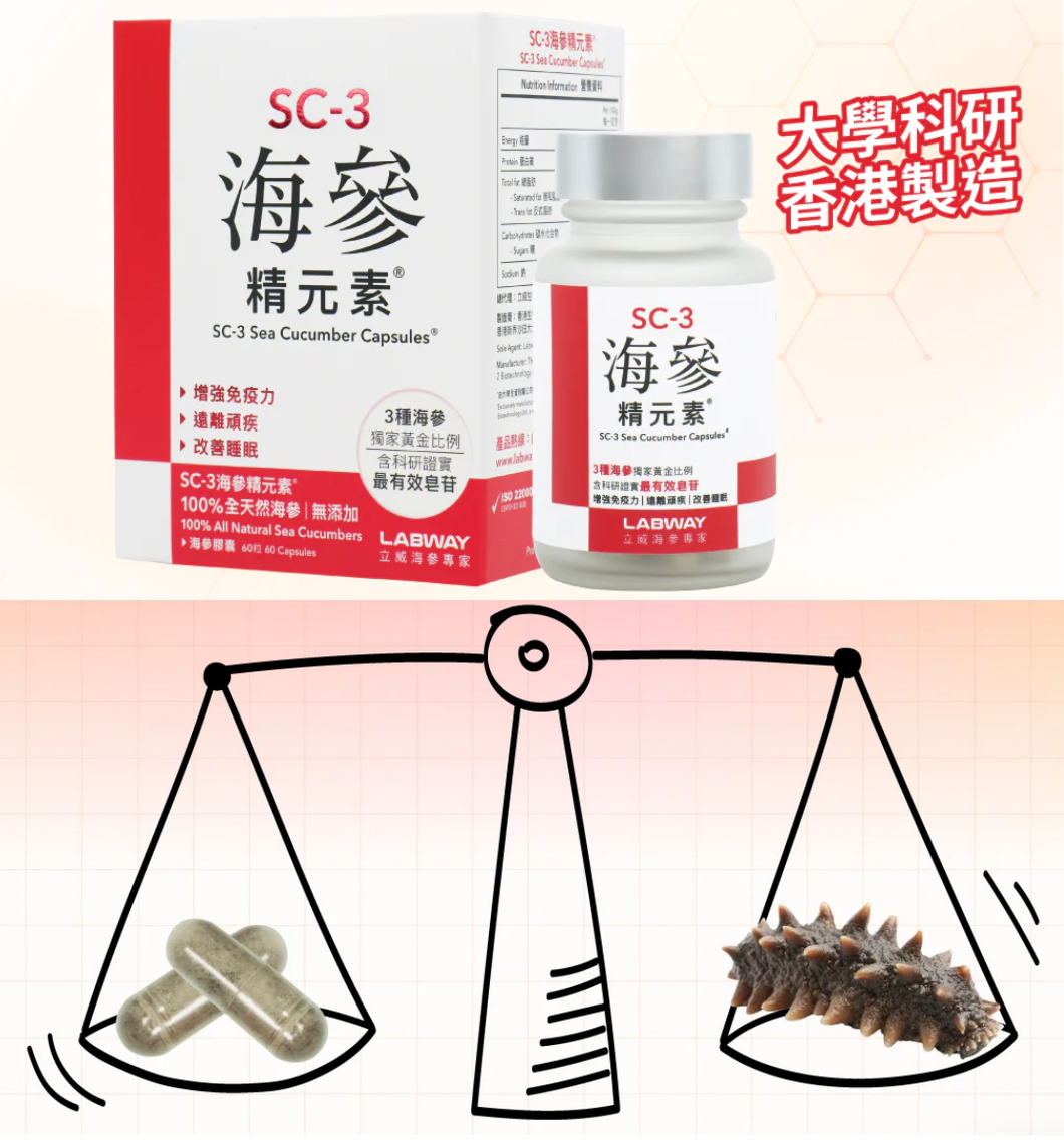 SC-3海參精元素是100%全天然海參丸,挑選3種全天然野生海參、以獨家黃金比例研製而成,2粒海參丸等同1條遼參,含科研證實最有效海參皂苷、海參黏多糖、18種氨基酸等營養成分。